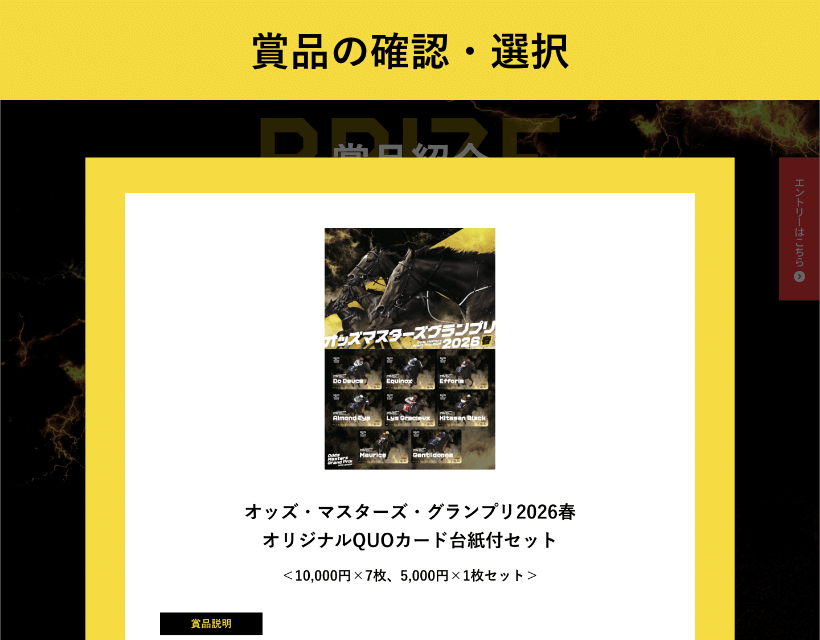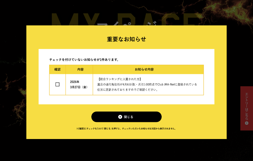 総合ランキングの順位に合わせて、応募可能な賞品や獲得した賞品をお知らせします。賞品の送付先はClub JRA-Netの登録情報を確認・変更ください。