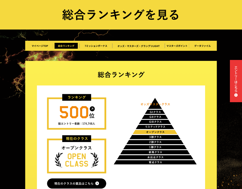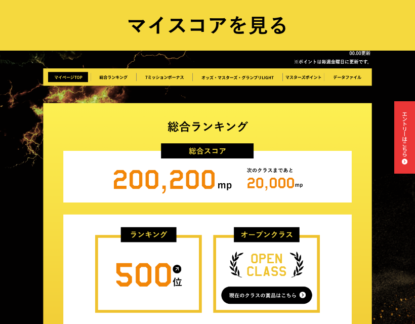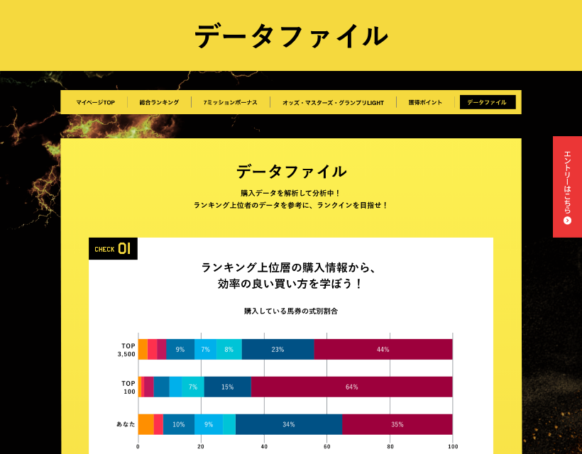 ランキングTOP100位およびTOP5,000位の方のデー夕と自分のデー夕を比較することができます。上位者の「購入している馬券の式別」「獲得mpの内訳」「式別ごとの的中率」などを参考に上位を目指しましょう。