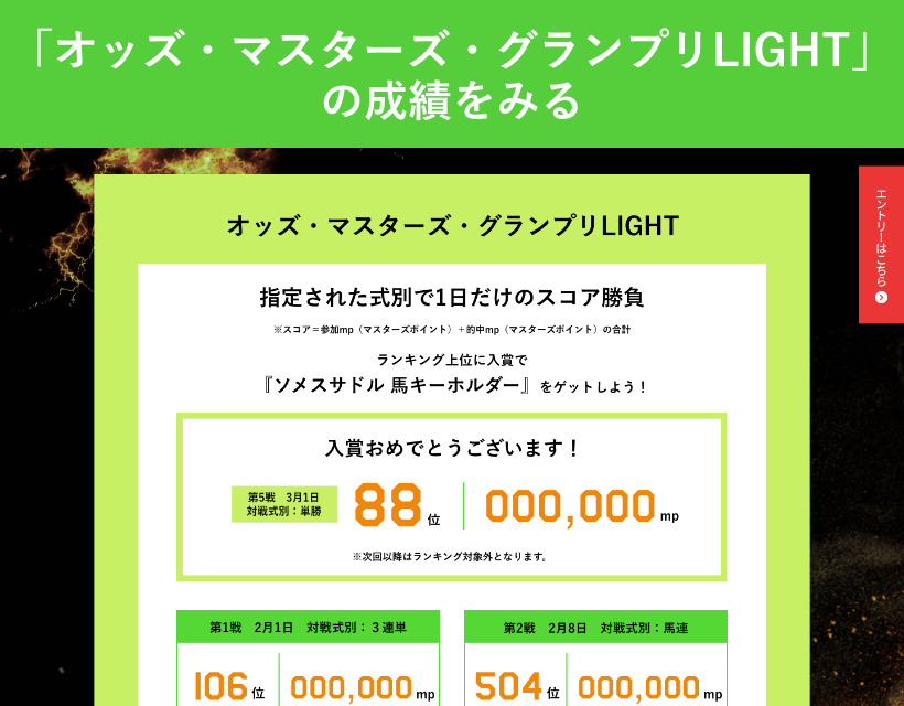 オッズ・マスターズ・グランプリLIGHTの成績などの